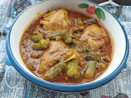 mit Okraschoten, Zwiebeln, Tomaten und spezieller Currysoße zubereitet